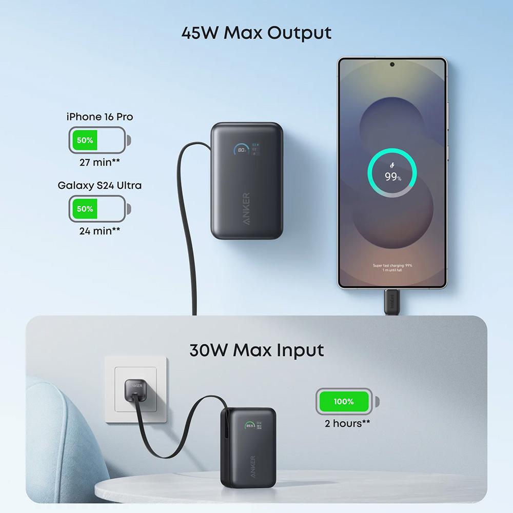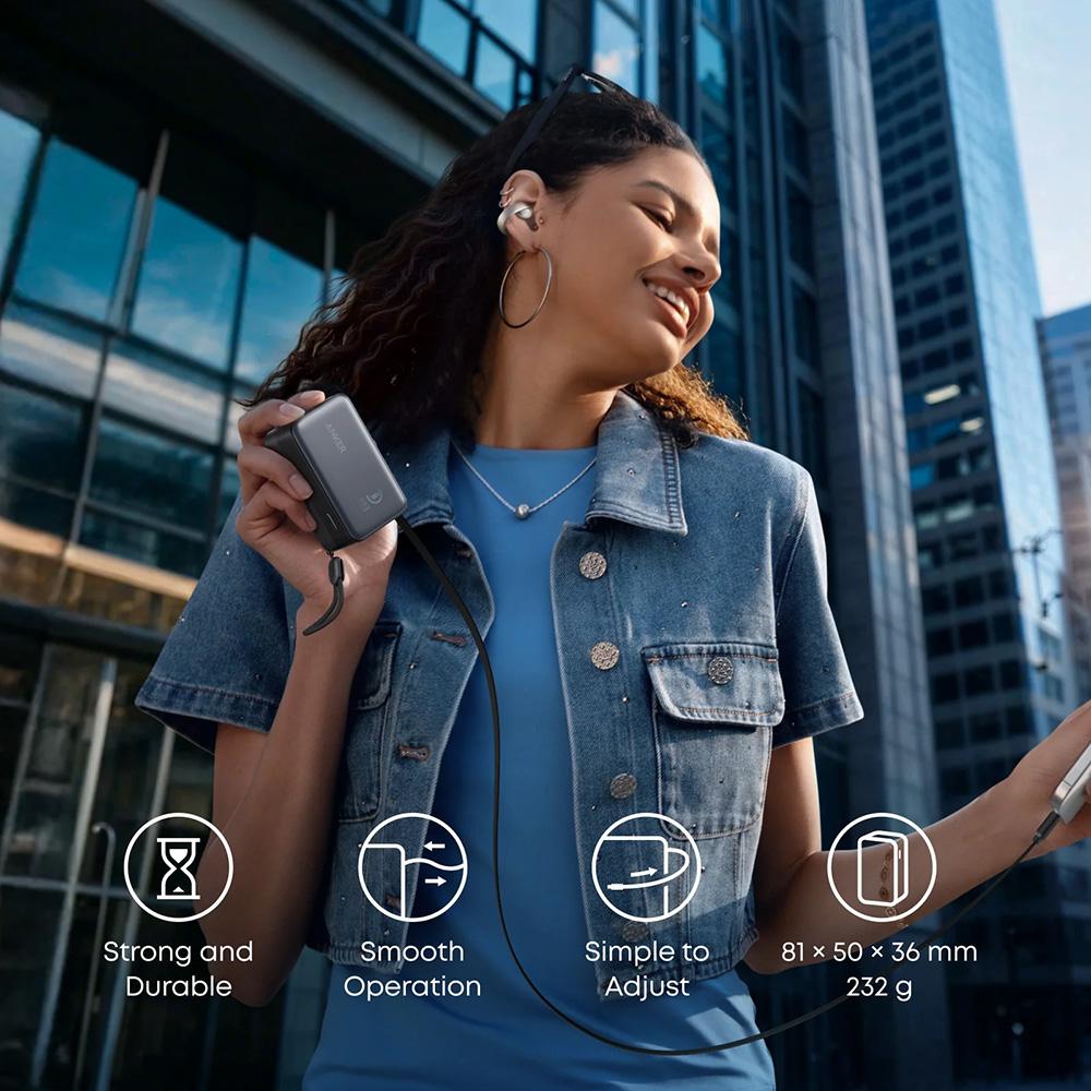 Batterie externe Anker Nano 10 000 mAh 45W avec câble USB-C rétractable intégré – Noir