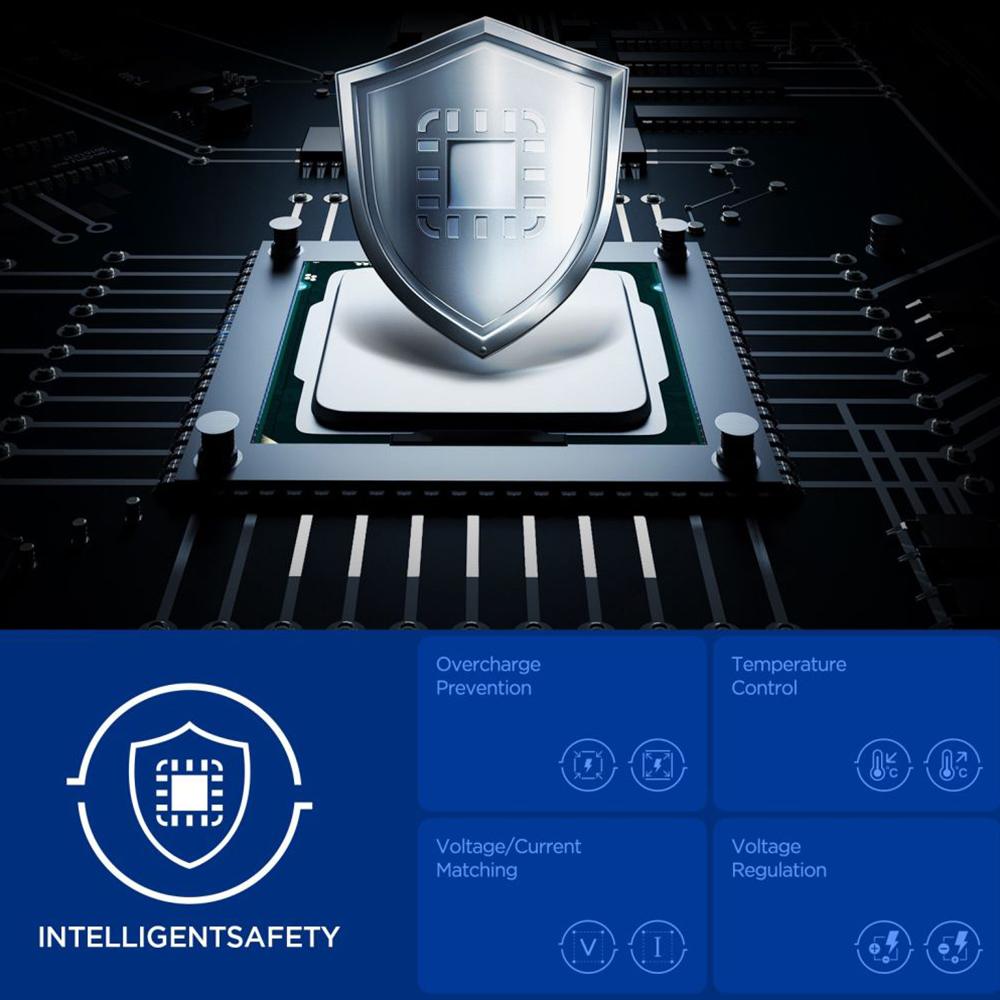 Côté sérénité, des protections intégrées contribuent à sécuriser la charge en limitant les risques liés aux variations électriques, pour brancher vos appareils en toute confiance.