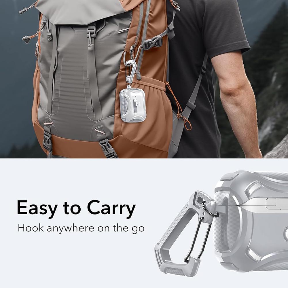 Sa structure en polymère durable avec renforts Air-Guard aide à absorber les chocs et à limiter les marques liées aux frottements et à l’usage répété. L’ouverture se fait d’un seul geste grâce à un slider frontal en caoutchouc, pratique pour accéder rapidement aux écouteurs d’une seule main, tout en conservant une excellente tenue lorsque l’étui est refermé.