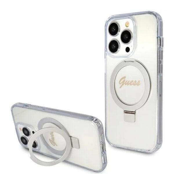 Coque Guess Ring Stand Script Glitter MagSafe pour iPhone 15 Pro – Purple
