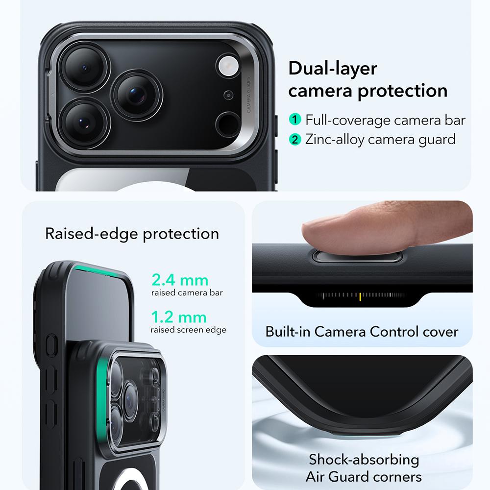 Cette coque hybride combine un dos rigide en matériaux de type PC/acrylique avec un contour souple en TPU renforcé aux coins pour absorber efficacement les impacts. Les bords surélevés autour de l’écran et du bloc photo limitent les rayures lorsque le smartphone est posé sur une surface. Les boutons sont recouverts de protections dédiées tandis que les découpes restent précises pour garder un accès confortable à tous les ports et fonctionnalités.