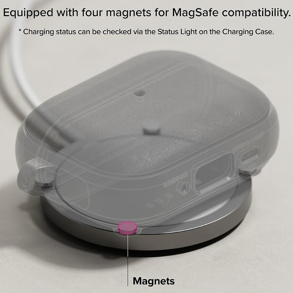La présence de magnets intégrés permet un alignement simple avec les chargeurs magnétiques et facilite la recharge sans fil, sans sacrifier la protection. La coque est également livrée avec un mousqueton, pratique pour l’attacher facilement à un sac, à une boucle ou à un trousseau, afin de garder vos écouteurs à portée de main.