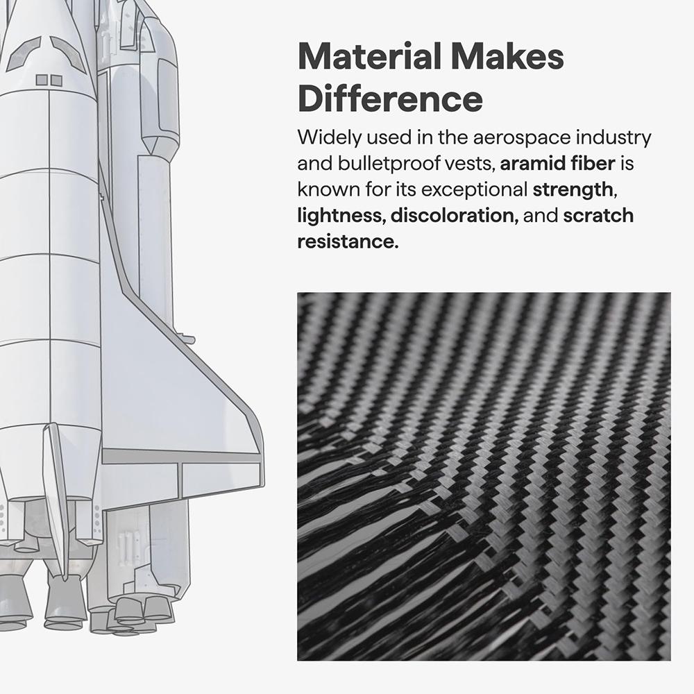 + Matériau en fibre d’aramide reconnu pour sa grande résistance aux chocs, rayures et à l’usure quotidienne.