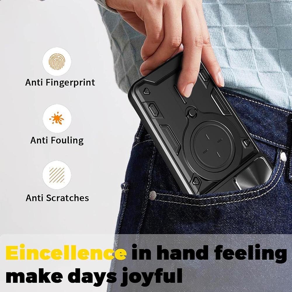 Pour encore plus de confort, la CamGuard Pro intègre un anneau métallique rotatif au dos qui sert à la fois de poignée sécurisée pour une meilleure prise en main et de support vidéo pour poser le téléphone en mode paysage. Cet anneau fonctionne aussi comme point d’ancrage idéal sur de nombreux supports magnétiques pour voiture, grâce à la plaque métallique intégrée dans la coque. Tu profites ainsi d’une solution tout-en-un pour la maison, le bureau et la route.