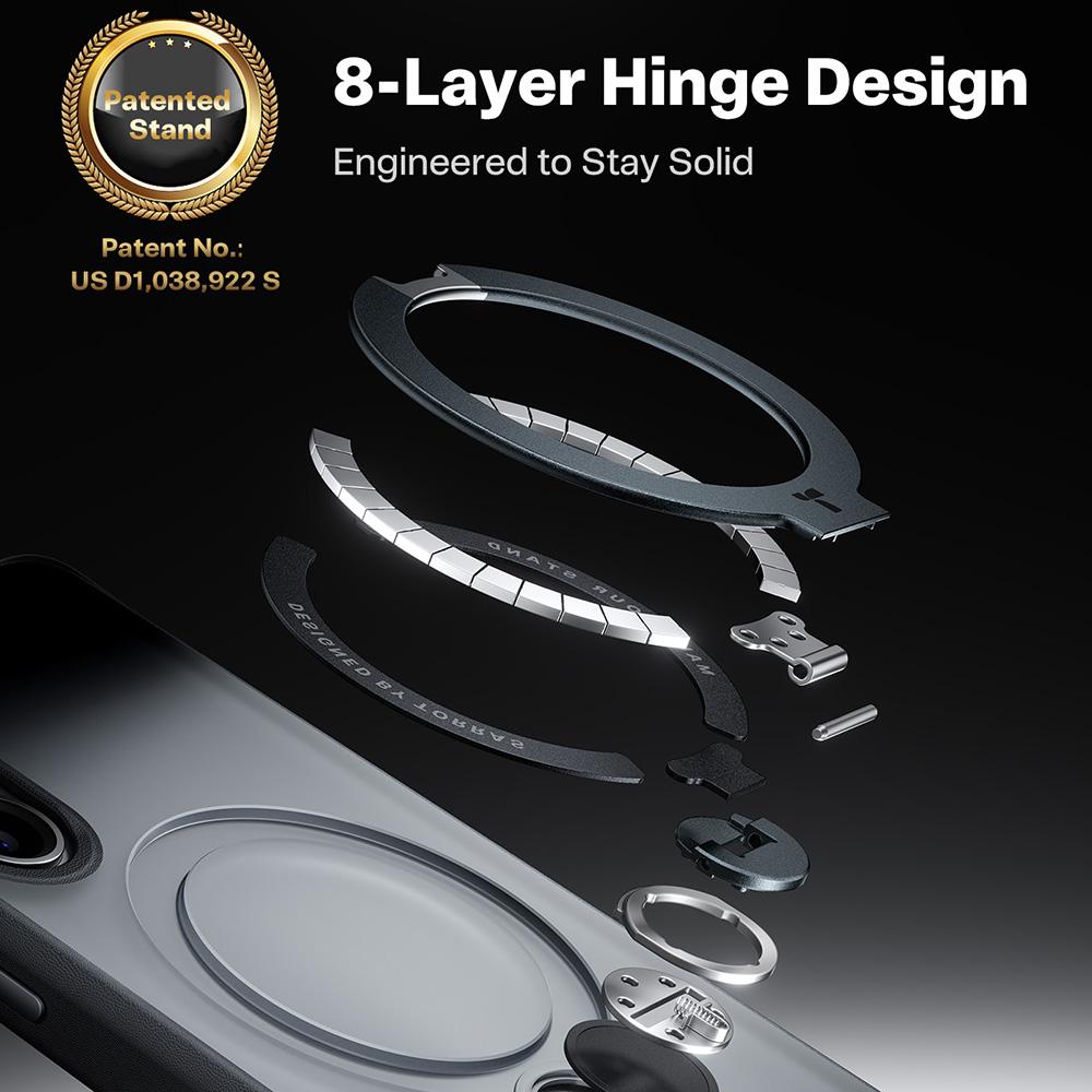 Son anneau support intégré, rotatif à 360°, se déploie en un geste pour servir de béquille stable en position verticale ou horizontale, idéal pour les vidéos, appels ou sessions de travail, puis se replie à plat pour ne pas encombrer. Il améliore aussi la préhension et limite efficacement les risques de glisse accidentelle.