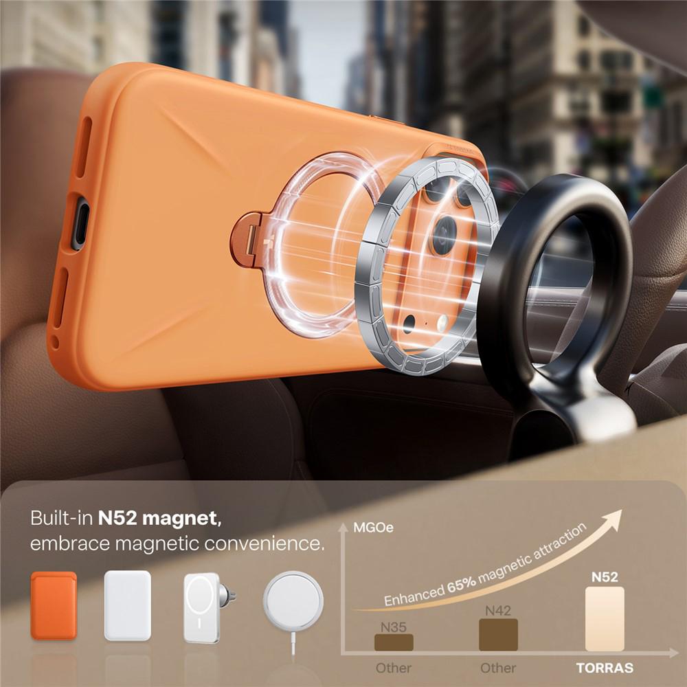La particularité de cette coque Torras est son support rotatif 3-en-1 intégré à l’arrière : il sert à la fois de béquille pour poser le smartphone, de bague pour mieux le tenir en main et de zone de fixation magnétique pour les accessoires compatibles. Le support pivote à 360°, ce qui permet d’alterner facilement entre orientation verticale et horizontale pour les vidéos, les visios ou la navigation.