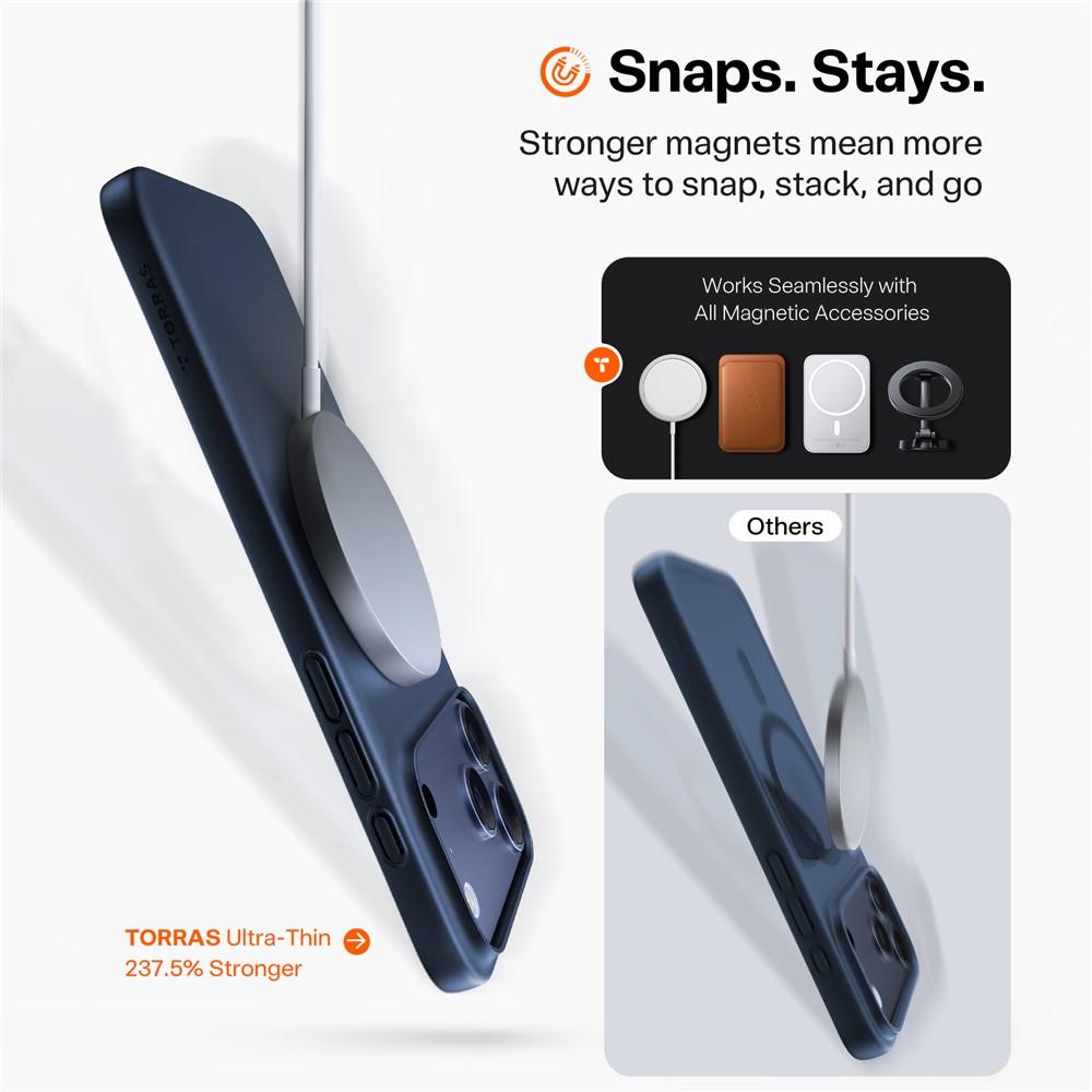 Son système magnétique intégré, compatible avec l’écosystème MagSafe, permet une fixation stable aux chargeurs et accessoires compatibles, pour un alignement fiable et une expérience de charge simplifiée. Le tout reste très fin et léger, ce qui fait de la Torras SlimFit Mag une coque idéale pour une protection discrète au quotidien, sans ajouter de volume superflu à votre appareil.