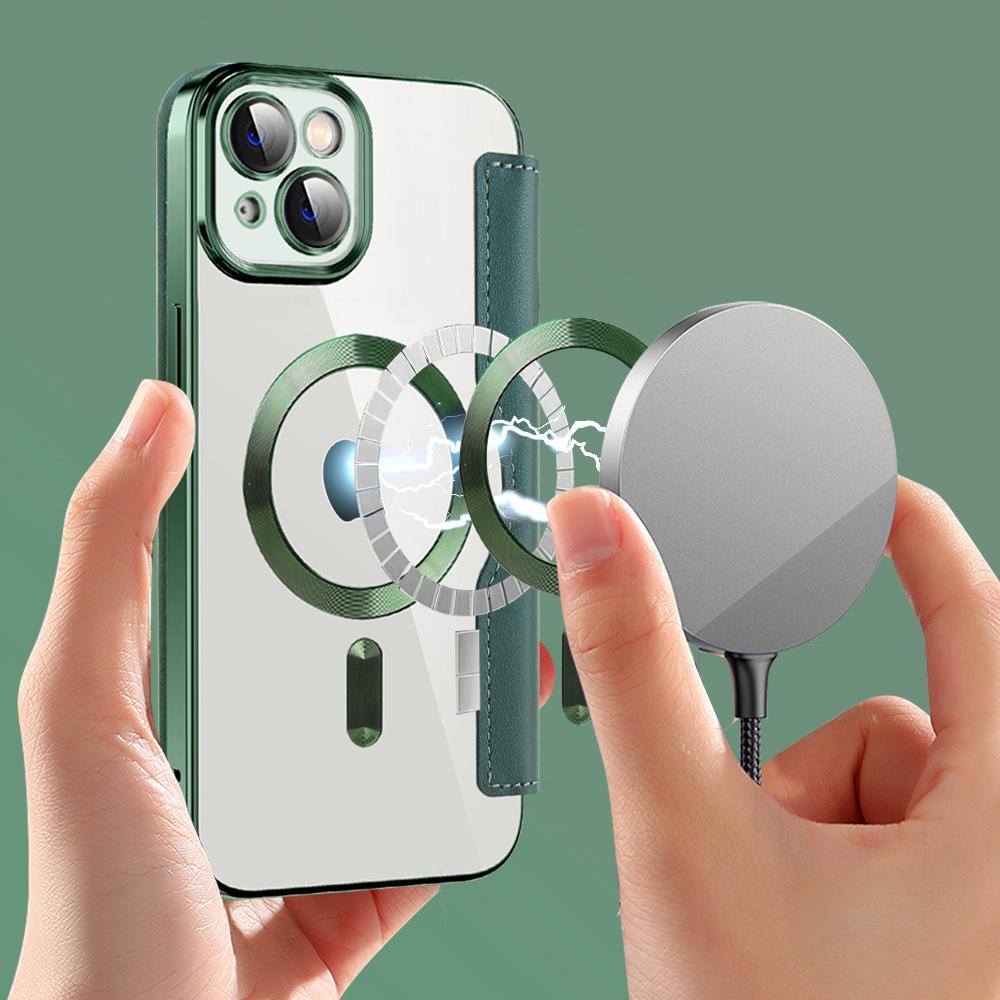 L’anneau magnétique intégré assure un alignement instantané avec les chargeurs et accessoires compatibles, pour une fixation stable et une charge sans fil efficace. À l’intérieur, des emplacements discrets permettent de glisser cartes et reçus, avec un rabat qui se transforme en support vidéo pour un confort mains libres.