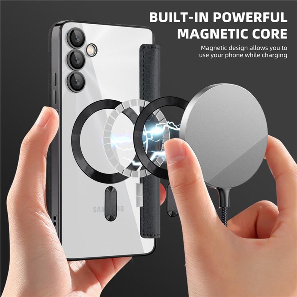 L’anneau magnétique intégré assure un alignement instantané avec les chargeurs et accessoires compatibles, pour une fixation stable et une charge sans fil efficace. À l’intérieur, des emplacements discrets permettent de glisser cartes et reçus, avec un rabat qui se transforme en support vidéo pour un confort mains libres.