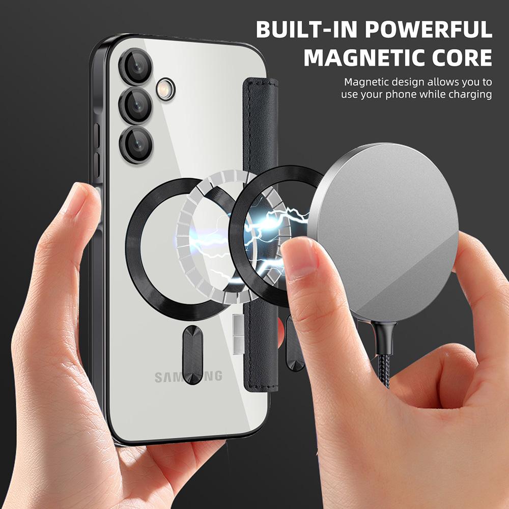 L’anneau magnétique intégré assure un alignement instantané avec les chargeurs et accessoires compatibles, pour une fixation stable et une charge sans fil efficace. À l’intérieur, des emplacements discrets permettent de glisser cartes et reçus, avec un rabat qui se transforme en support vidéo pour un confort mains libres.