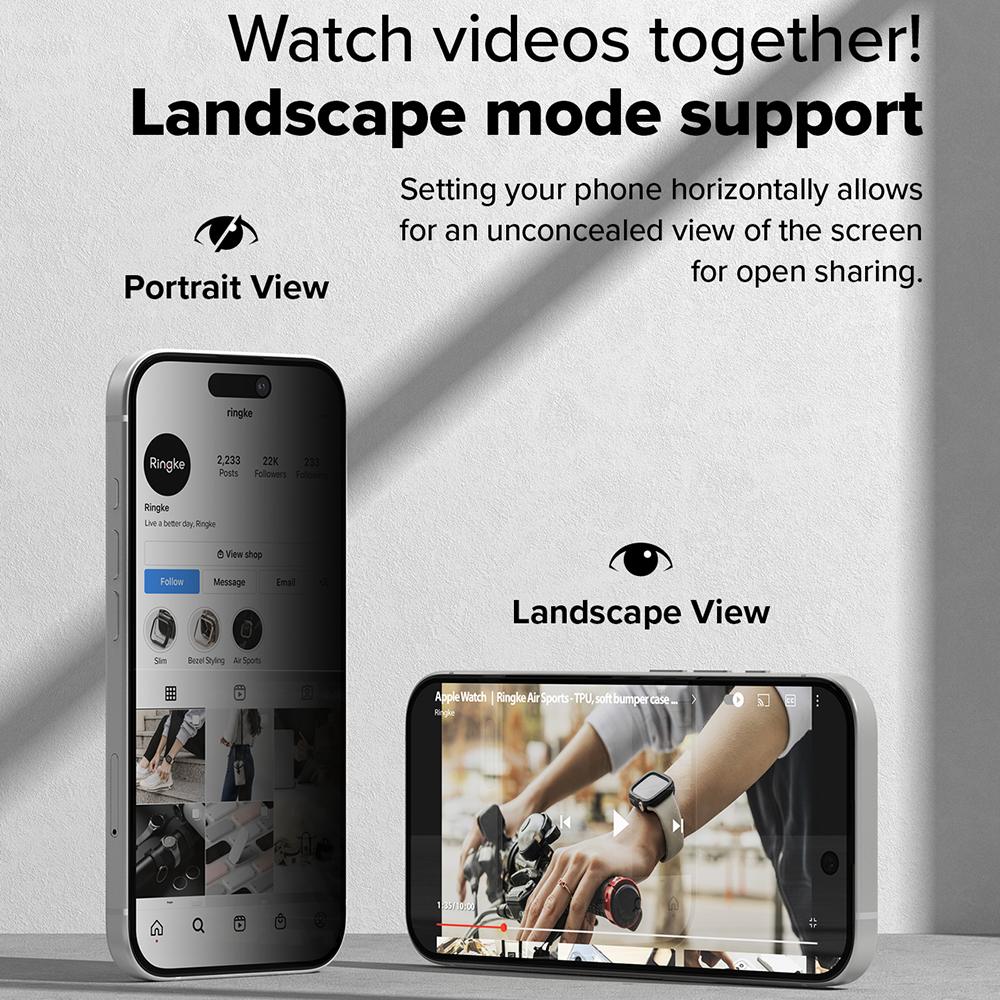 Le filtre de confidentialité 2 voies réduit l’angle de vision latéral, idéal dans les transports, au bureau ou dans les lieux publics. Vous profitez pleinement de vos messages, vidéos et contenus, tandis que les personnes autour de vous ne voient qu’un écran assombri. L’affichage reste clair et net lorsque vous regardez l’écran de face.